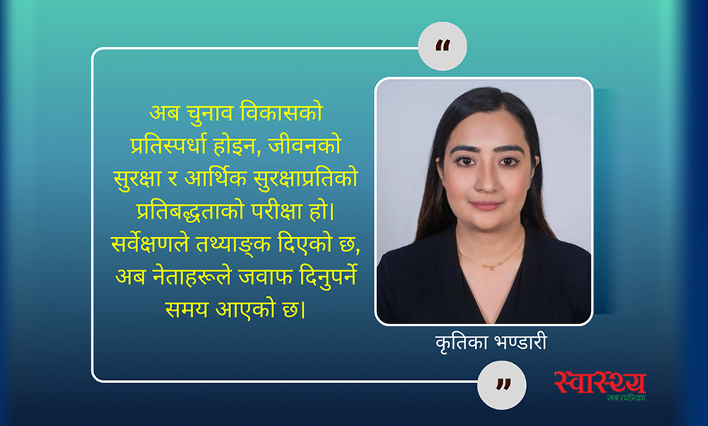 घाँटी हेरेर हाड निल्नु भनिएजस्तै हाम्रो राष्ट्रिय बजेटको आधारमा घोषणापत्र बनाउनुपर्छ भन्ने मलाई लाग्छ। स्वास्थ्य क्षेत्रलाई प्रमुख प्राथमिकतामा रुपमा कुनै पनि दलले लिएको जस्तो मलाई लाग्दैन। बेलायत, अमेरिका जस्ता विकसित मुलुकमा सबैभन्दा पहिलो प्राथमिकतामा स्वास्थ्य क्षेत्रलाई राख्ने गरिन्छ।