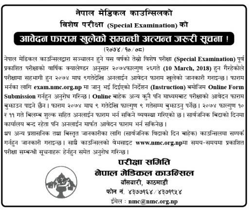 काठमाडौं- नेपाल मेडिकल काउन्सिलले आगामि फागुनमा विशेषज्ञ डाक्टरको लाइसेन्सिङ परीक्षा लिने भएको छ। काउन्सिलले आज सार्वजनिक सूचना जारी गर्दै विशेषज्ञ दर्ता प्रमाणपत्रको लागि लिइने विशेष परीक्षा (स्पेशल एक्जामिनेसन) आगामी २६ फागुनमा लिने जनाएको छ ।