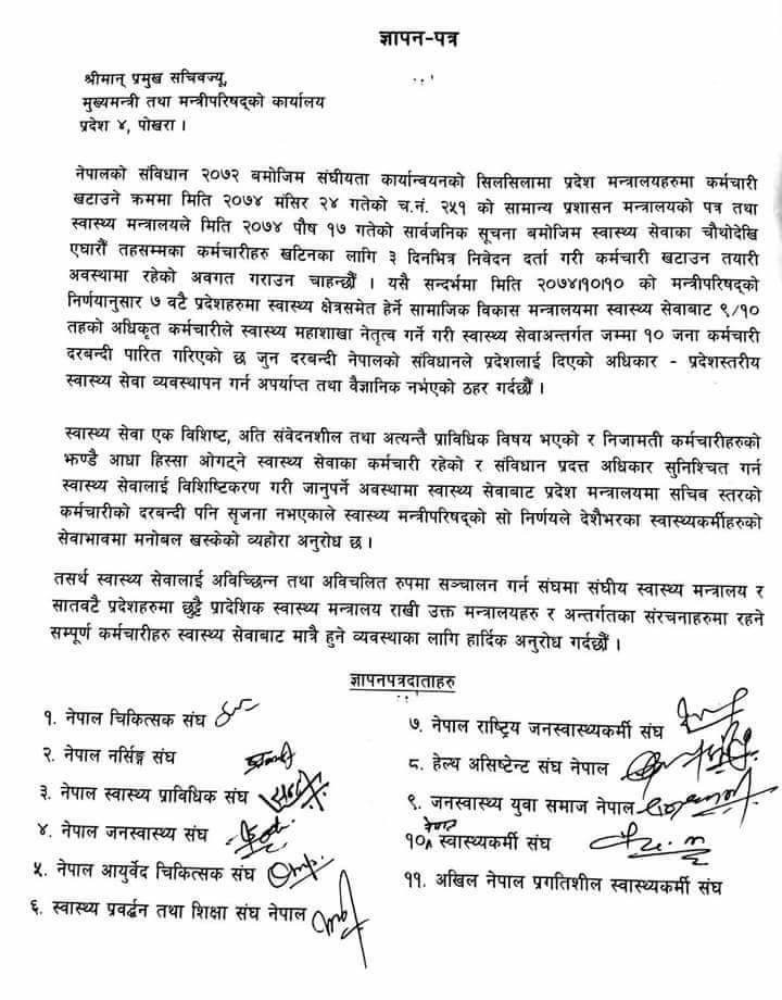 नेपाल चिकित्सक संघ, नेपाल 4 संघ, नेपाल स्वास्थ्य प्राविधिक संघ, नेपाल जनस्वास्थ्य संघ, नेपाल आयुर्वेद चिकित्सक संघ, स्वास्थ्य प्रवद्र्ध तथा शिक्षा संघ नेपा नेपाल राष्ट्रिय जनस्वास्थ्यकर्मी संघ, हेल्थ असिस्६नेन्ट संघ नेपाल, जनस्वास्थ्य युवा समाज नोल, नेपाल स्वास्थ्यकर्मी संघ र अखिल नेपाल प्रगतिशील स्वास्थ्यकर्मी संघले नेपालले संयुक्त रुपमा ज्ञापन पत्र बुझाएका हुन् ।