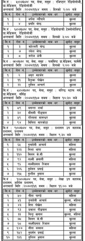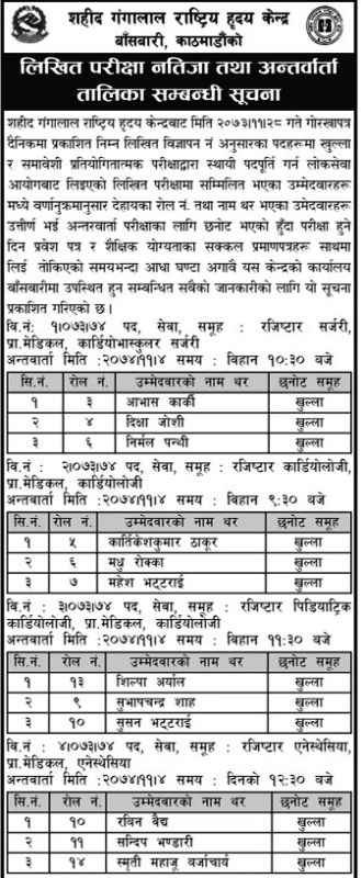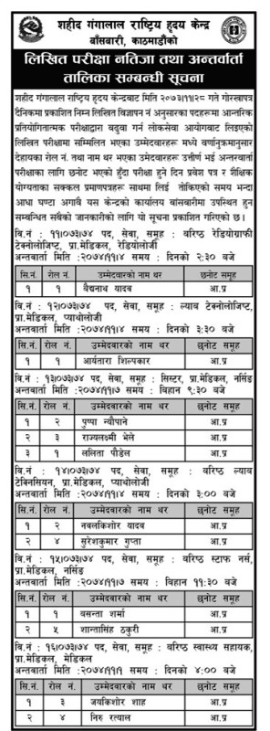 काठमाडौं- सहिद गंगालाल राष्ट्रिय हृदय केन्द्रले 4, ल्याब, फार्मेसी लगायतका क्षेत्रमा आवश्यक जनशक्तिका लागि लिएको लिखित परीक्षाको नतिजा सार्वजनिक गरेको छ। लिखितमा पास भएकाहरुको 9 परीक्षा पनि हुने छ ।