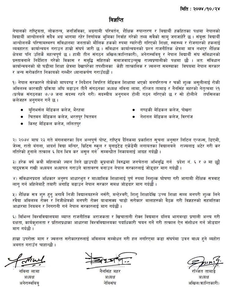 सरकारले तोकेको मापदण्ड र निर्देशन विपरित मेडिकल शिक्षामा मनोमानी गर्दै चर्को शुल्क असुली गर्ने मेडिकल कलेजको अध्ययन गर्न ती संगठनले अध्यक्षत्रयको नेतृत्वमा २१ सदस्यीय टोली गठन गरेका हुन्। टोलीमा प्रत्येक विद्यार्थी संगठनबाट ७/७ जना सदस्य रहनेछन्।