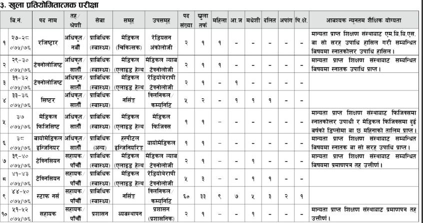 काठमाडौै– बिपी कोइराला मेमोरियल क्यान्सर अस्पताल, भरतपुर चितवनले ६५ नर्स सहित विभिन्न पदमा स्थायी पदपूर्तिका लागि दरखास्ता आव्हान गरेको छ। इच्छुक उम्मेदवारले फागुन १८ गतेभित्र दरखास्त दिन सूचना जारी गरिएको छ।