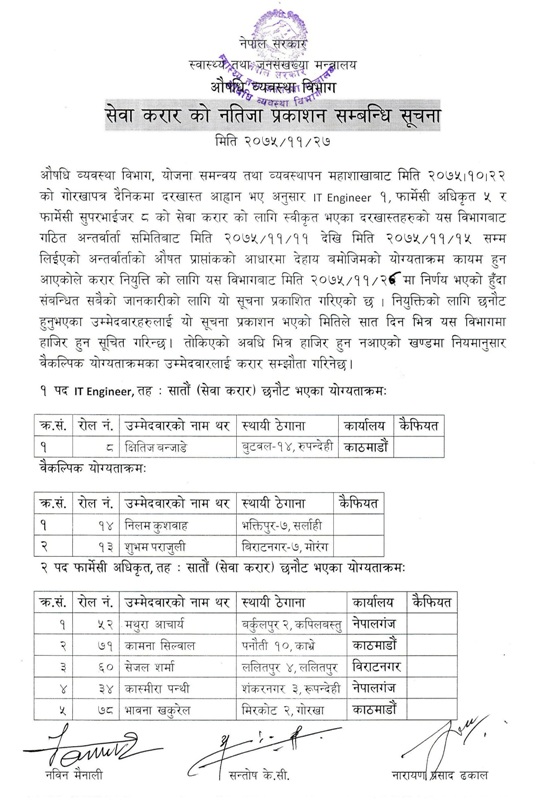 काठमाडौं- औषधि व्यवस्था विभागले आइटी इन्जिनियर, फार्मेसी अधिकृत तथा फार्मेसी सुपरभाईजरको करार पदको नतिजा सार्वजनिक गरेको छ।