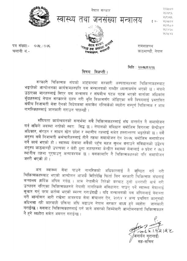‘स्वास्थ्य सेवा पाउने नागरिकको अधिकारलाई नै कुण्ठित गर्ने गरी चिकित्सकहरुबाट भएको आन्दोलन आजकै मितिदेखि फिर्ता लिन सरकारी चिकित्सक संघलाई मन्त्रालय अपिल गर्दछ,’ विज्ञप्तिमा भनिएको छ, 'आम नेपालीले तिरेको करबाट ठूलो धनराशी खर्च गरी उत्पादन गरिएका चिकित्सकहरुले नेपाली नागरिकले संविधानत: पाउनु पर्ने स्वास्थ्य सेवालाई सुचारु गर्नु परम कर्तव्य भएको स्मरण गराउँदछौं।'
