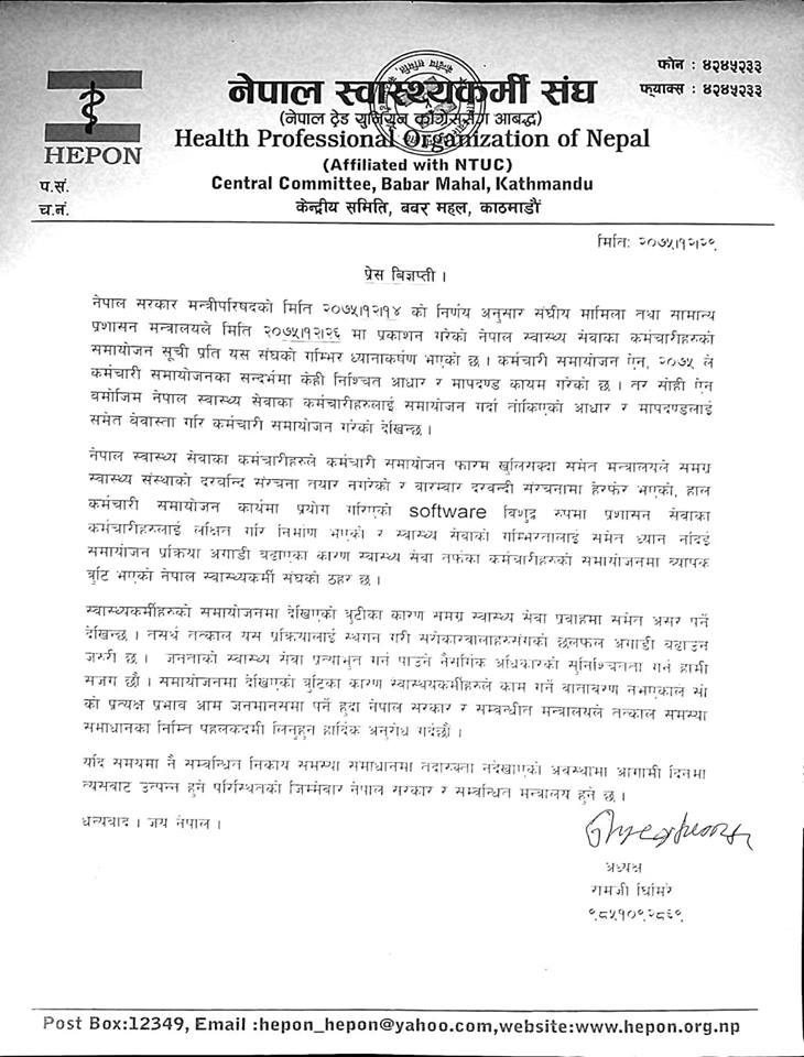 ‘संघीय मामिला तथा सामान्य प्रशासन मन्त्रालयले प्रकाशन गरेको स्वास्थ्य सेवाका कर्मचारीहरुको समायोजन सूचीप्रति संघको गम्भिर ध्यानाकर्षण भएको छ,’ विज्ञप्तिमा भनिएको छ, ‘समायोजनमा व्यापक त्रुटि भएको नेपाल स्वास्थ्यकर्मी संघको ठहर छ। स्वास्थ्यकर्मीहरुको समायोजनमा देखिएको त्रुटिका कारण समग्र स्वास्थ्य सेवा प्रवाहमा समेत असर पर्ने देखिन्छ। तसर्थ तत्काल यस प्रक्रियालाई स्थगन गरी सरोकारवालाहरुसंगको छलफल अगाडी बढाउन जरुरी छ।’