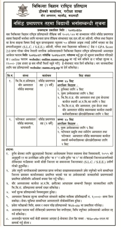 चिकित्सा विज्ञान राष्ट्रिय प्रतिष्ठान, वीर अस्पताल नर्सिङ क्याम्पस र परोपकार अस्पताल, नर्सिङ क्याम्पस, थापाथलीले तीन वर्षे नर्सिङ प्रमाणपत्रको लागि ४० सिट भर्ना लिने भएका छन्। जसमा पुरुष विद्यार्थीका लागि ६ सिट खोलिएको छ।