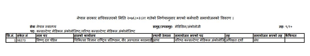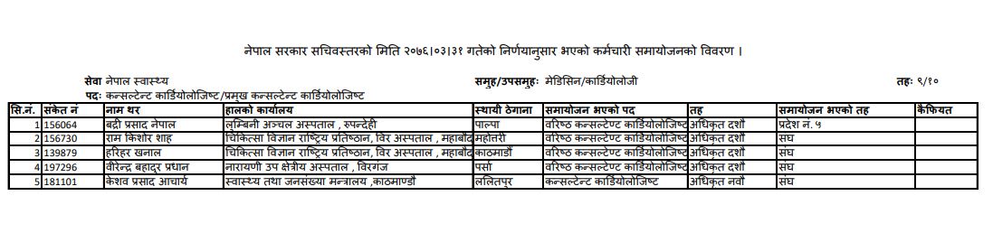 काठमाडौं- स्वास्थ्य तथा जनसंख्या मन्त्रालयले कार्डियोलोजिष्ट र अंकोलोजिष्ट९ र १० औं तहको समयोजना सूची सार्वजनिक गरेको छ।