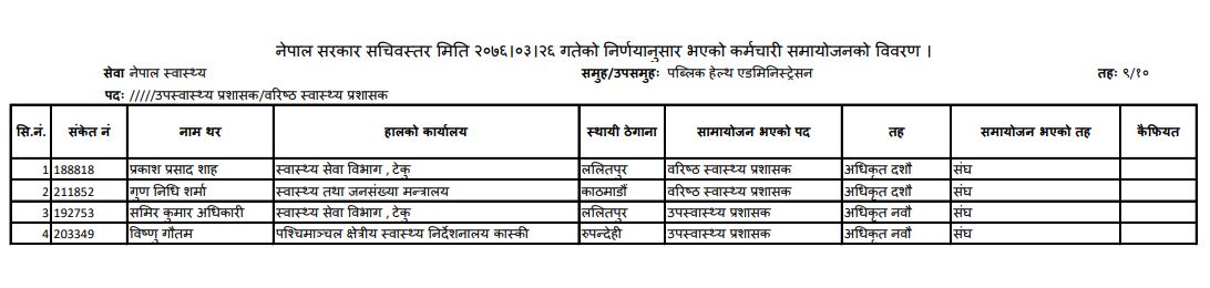 काठमाडौं- स्वास्थ्य तथा जनसंख्या मन्त्रालयले वरिष्ठ स्वास्थ्य प्रशासक/उपस्वास्थ्य प्रशासक ९ र १० तहका कर्मचारीहरुको समायोजन समयोजना सूची सार्वजनिक गरेको छ।