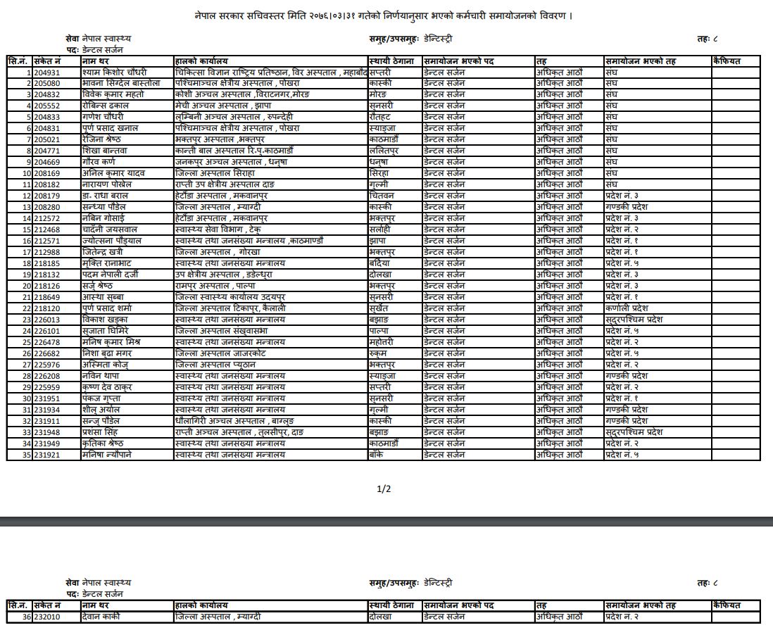 काठमाडौं- स्वास्थ्य तथा जनसंख्या मन्त्रालयले डेन्टल सर्जन ९ र १० औं समयोजना सूची सार्वजनिक गरेको छ।