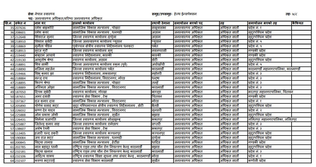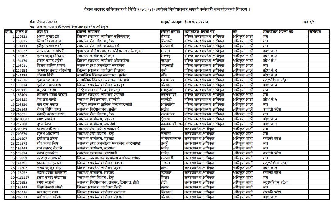 काठमाडौं- स्वास्थ्य तथा जनसंख्या मन्त्रालयले जनस्वास्थ्य अधिकृत ७ र ८ औं तहको समयोजना सूची सार्वजनिक गरेको छ।