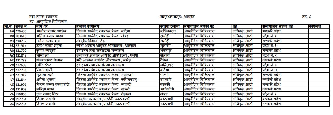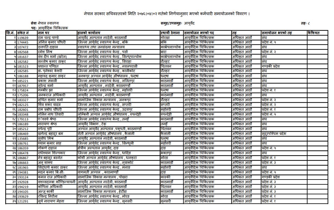 काठमाडौं- स्वास्थ्य तथा जनसंख्या मन्त्रालयले आयुर्वेदिक चिकित्सक ८ तहका कर्मचारीहरुको समायोजन सूची सार्वजनिक गरेको छ।