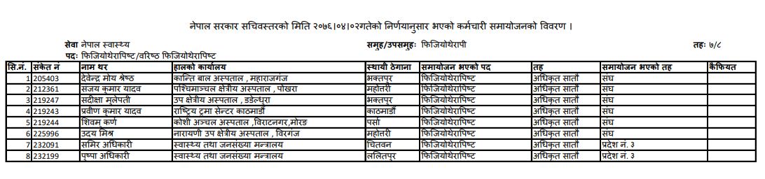 काठमाडौं- स्वास्थ्य तथा जनसंख्या मन्त्रालयले फिजियोथेरापिष्ट ७।८ तहका कर्मचारीहरुको समायोजन सूची सार्वजनिक गरेको छ।