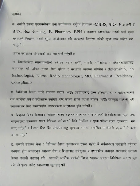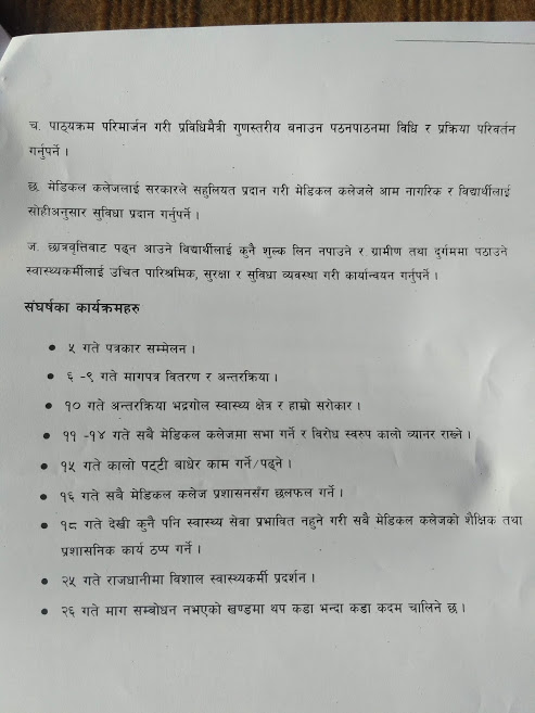 समितिले राजधानीमा एक कार्यक्रम गरी माग पुरा गर्न एक साताको समयसिमा दिएको हो। उक्त अवधिमा पनि माग पुरा नभए अस्पतालको सेवामा असर नपर्ने गरी शैक्षिक र प्रशासनिक काम ठप्पा पार्ने निर्णय भएको समितिका संयोजक प्रकाश चन्दले जानकारी दिए।