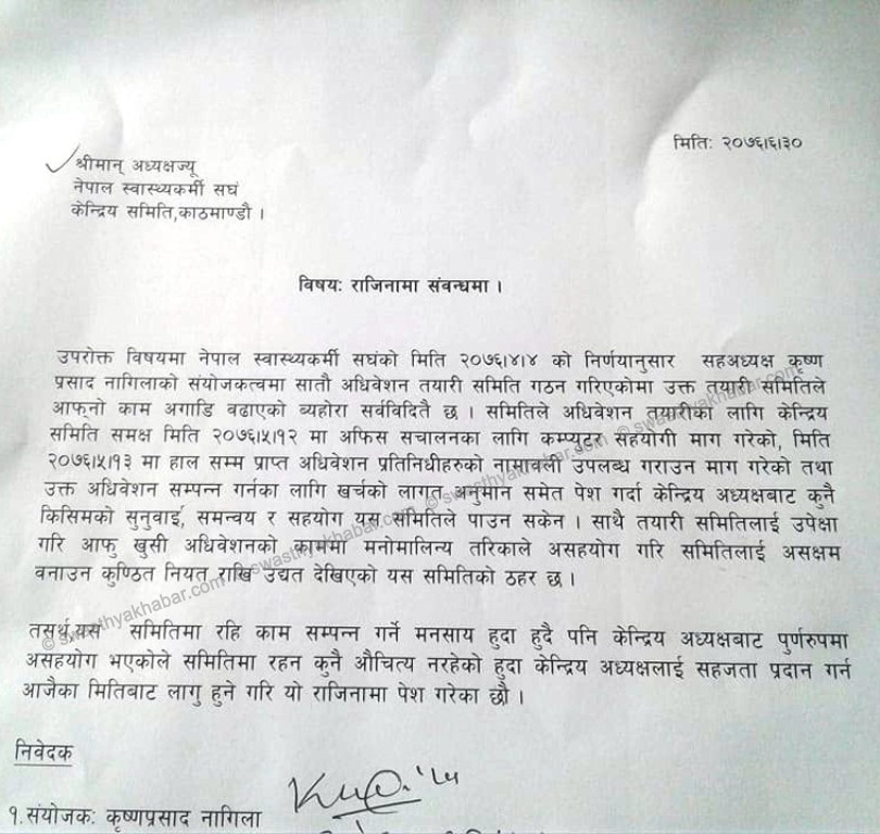काठमाडौं – नेपाल स्वास्थ्यकर्मी संघको सातौं अधिवेशन तयारी समितिका संयोजक कृष्णप्रसाद नागिलाले राजिनामा दिएका छन्।