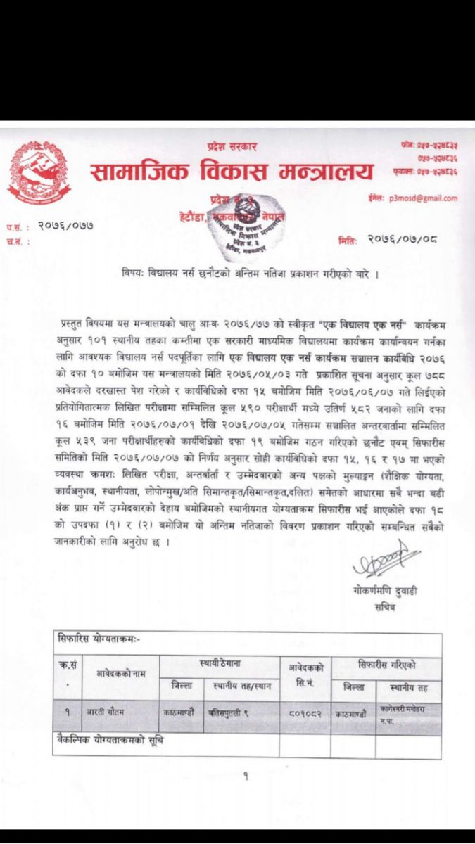 काठमाडौँ– २०७६\७७ का लागि ‘एक विद्यालय एक नर्स’ कार्यक्रमका लागि नर्स छनौटको अन्तिम नतिजा आज प्रदेश ३ सामाजिक विकास मन्त्रालयले सार्वजनिक गरेको छ।