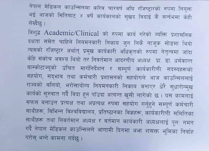 डा शर्माले आजबाट काउन्सिल रजिष्ट्रारबाट बिदा लिएका हुन्। उनले चार वर्ष अघि आजकै दिन उक्त पदको जिम्मेवारी सम्हालेका थिए।