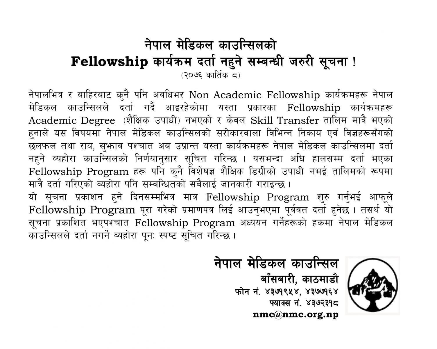 नेपाल र बाहिरबाट कुनै पनि अवधिभर नन् एकेडेमिक फेलोसिप कार्यक्रमहरु नेपाल मेडिकल काउन्सिलमा दर्ता गर्दै आइरहेकोमा यस्ता प्रकारका कार्यक्रम शैक्षिक उपाधि नभएको र केवल स्कील ट्रान्सफर तालिम मात्र भएकोले दर्ता नगर्ने निर्णय गरिएको हो।