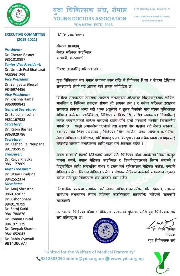 नेपाल सरकारले दिएको निर्देशनको अवज्ञा गर्ने, चिकित्सा शिक्षा आयोगको नियम कानुन पालना नगर्ने, नेपाल मेडिकल काउन्सिल र विश्वविद्यालयको नियम नमान्ने र विद्यार्थीहरु माथि अमानवीय व्यवहार तथा दमन गर्ने युनिभर्सल मेडिकल कलेज, गण्डकी मेडिकल कलेज, चितवन मेडिकल कलेज र नेशनल मेडिकल कलेजको सम्बन्धन तत्काल खारेज गर्न युवा चिकित्सक सघंले जोडदार माग समेत गरेकाे छ।