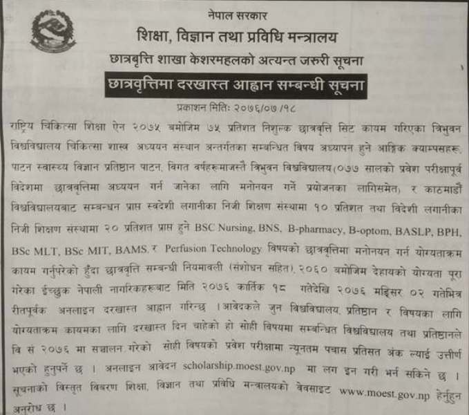 मन्त्रालयले त्रिवि चिकित्साशास्त्र अध्ययन संस्थान अन्र्तगतका आंगिक क्याम्पसहरु, पाटन स्वास्थ्य विज्ञान प्रतिष्ठान र काठमाडौं विश्वविद्यालयबाट सम्बन्धन प्राप्त स्वदेशी लगानीका निजि शिक्षण संस्थामा १० प्रतिशत तथा विदेशी लगानीका निजि शिक्षण संस्थामा २० प्रतिशत प्राप्त हुने विभिन्न १० विषयका लागि छात्रवृत्तिमा दरखास्त मागेको हो।