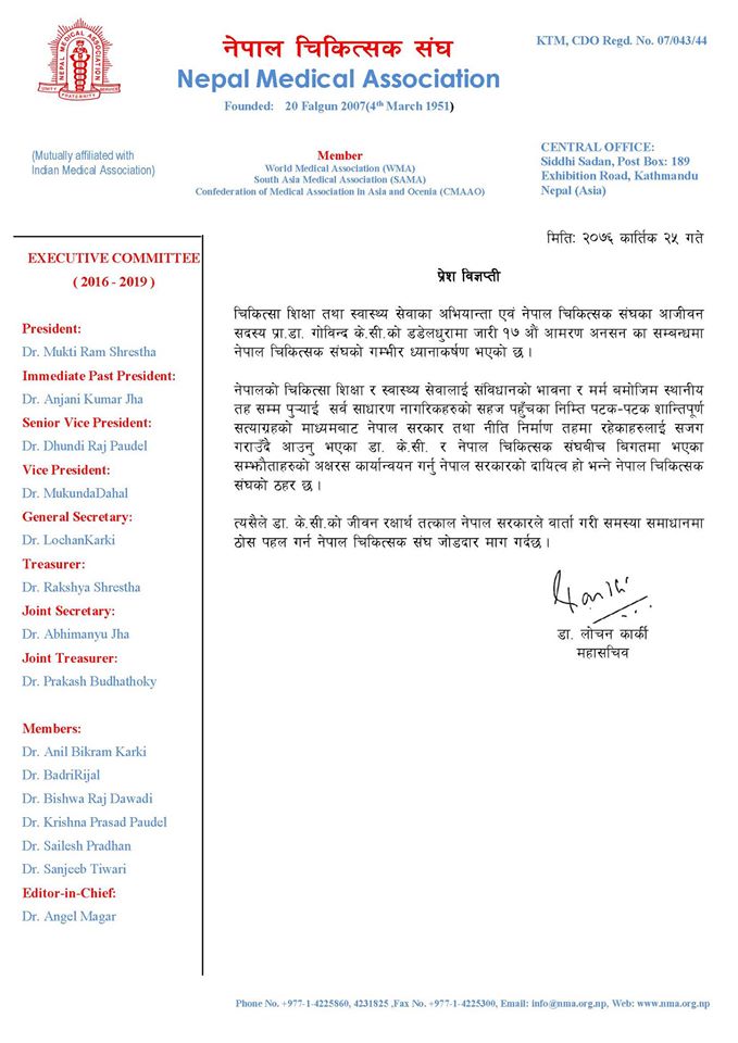 ‘नेपालको चिकित्सा शिक्षा र स्वास्थ्य सेवालाई संविधानको भावना र मर्म बमोजिम स्थानीय तह सम्म पु¥याई, सर्वसाधारण नागरिकहरुको सहज पहुँचका निम्ति पटक–पटक शान्तिपूर्ण सत्याग्रहको माध्यमबाट नेपाल सरकार तथा नीति निर्माण तहमा रहेकाहरुलाई सजग गराउँदै आएका डा केसी र नेपाल चिकित्सक संघबीच बिगतमा भएका सम्झौताहरुको कार्यान्वयन गर्नु नेपाल सरकारको दायित्व भएको संघको ठहर गरेको छ,’ विज्ञप्तिमा भनिएको छ।