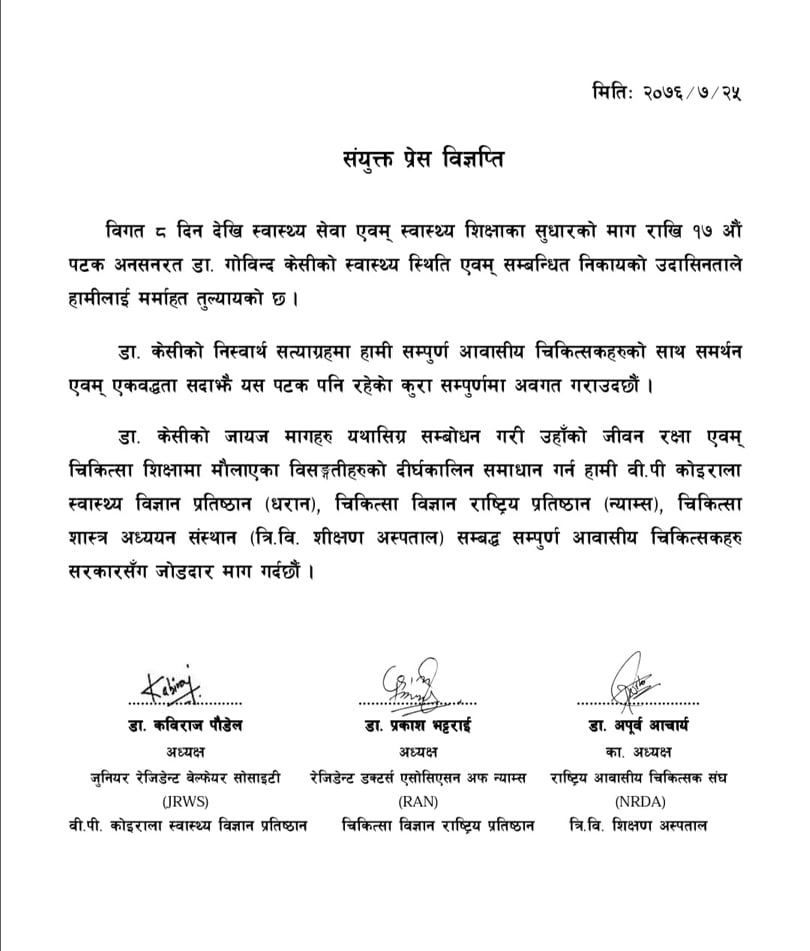 तीनवटै संस्थामा रहेको आवासिय चिकित्सकहरुको संस्थाले सोमबार संयुक्त विज्ञप्ति जारी गर्दै डा केसीको माग पुरा गर्न सरकारको ध्यानाकर्षण गरेका हुन्।