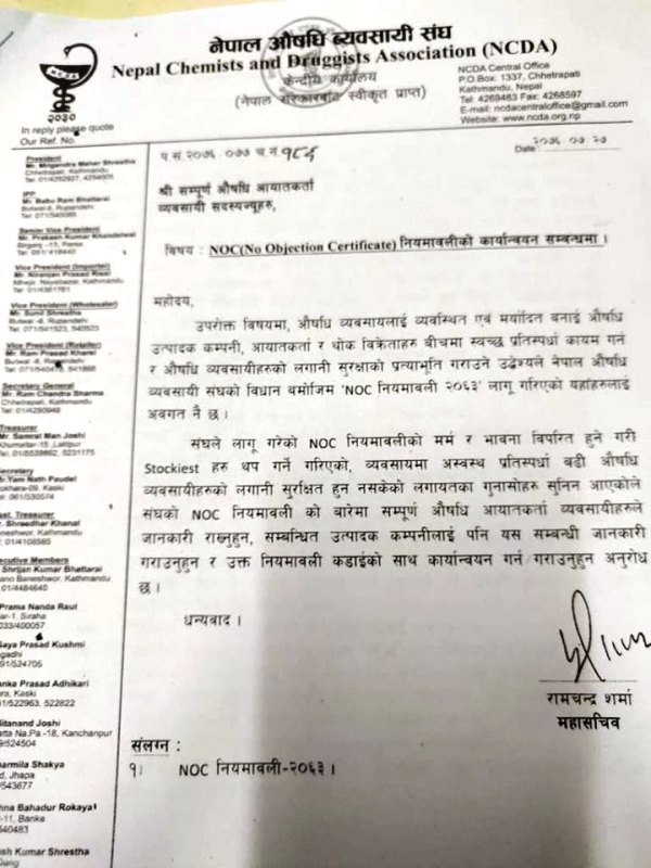 एसोसिएसनले एनओसीका बारेमा सम्पूर्ण औषधि आयातकर्ता तथा उत्पादक कम्पनीले पनि यस सम्बन्धी चासो राख्न र नियमवाली कडाईका साथ कार्यान्वयन गर्न अनुरोध गरेको छ।