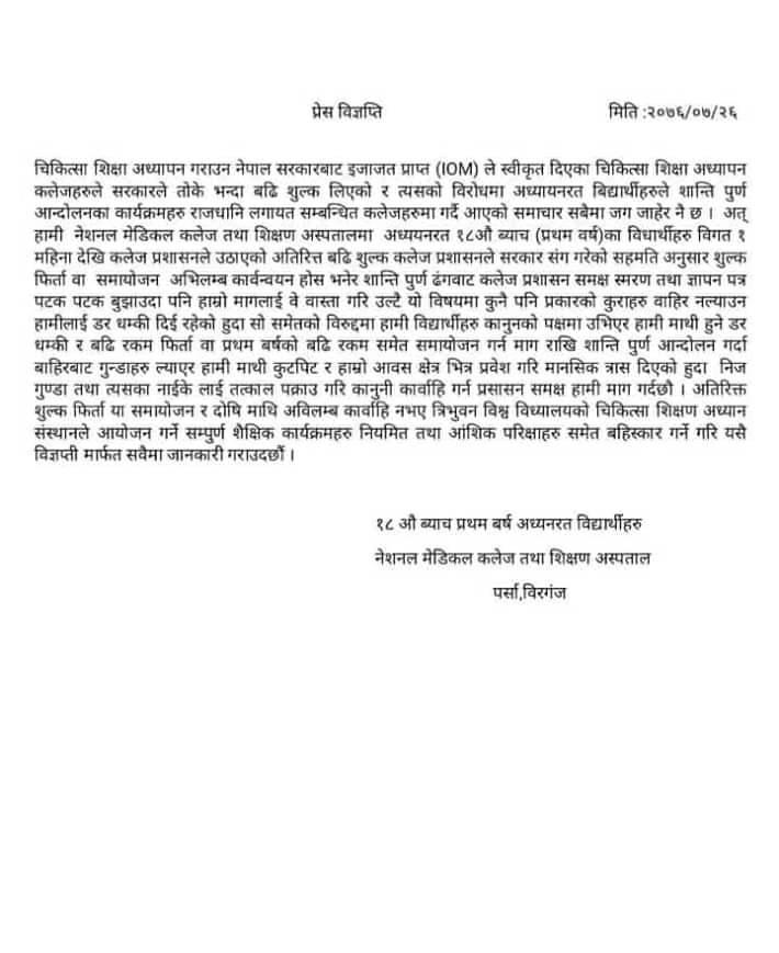 ‘कलेज प्रशासनले उठाएको अतिरिक्त शुल्क, कलेज प्रशासनले सरकारसँग गरेको सहमति अनुसार शुल्क फिर्ता वा समायोजन कार्यन्ययनलाई शान्तिपूर्ण ढंगबाट कलेज प्रशासन समक्ष स्मरण तथा ज्ञापन पत्र पटक पटक बुझाएका थियौँ,’ विद्यार्थीले निकालेको विज्ञप्तिमा भनिएको छ, ‘तर हाम्रो मागलाई वेवास्ता गरि उल्टै यो विषयमा कुनै पनि प्रकारको कुराहरु बाहिर नल्याउन डर धम्की दिइरहेकको, शान्ति पूर्ण आन्दोलन गर्दा आहिरबाट गुन्डाहरु ल्याएर विधार्थीहरु माथी कुटपिट र आवस भित्र गएर मानसिक त्रास दिएको हुँदा निज गुण्डालाई कार्वाही गर्न माग गरेका छौँ।’