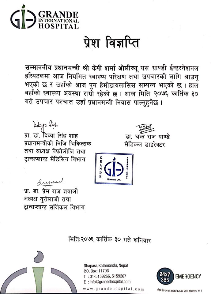 प्रधानमन्त्रीको स्वास्थ्य अवस्था प्रधानमन्त्रीको नीजि चिकित्सक दिव्या सिंह शाह, ग्रान्डीका मेडिकल डाइरेक्टर डा चक्रराज पाण्डे र युरोलोजी तथा ट्रान्सप्लान्ट सर्जिकल विभागका अध्यक्ष प्रा डा प्रेमराज ज्ञवालीले विज्ञप्ति प्रकाशित गरी उनको अवस्था राम्रो भएको जानकारी गराएका हुन्।