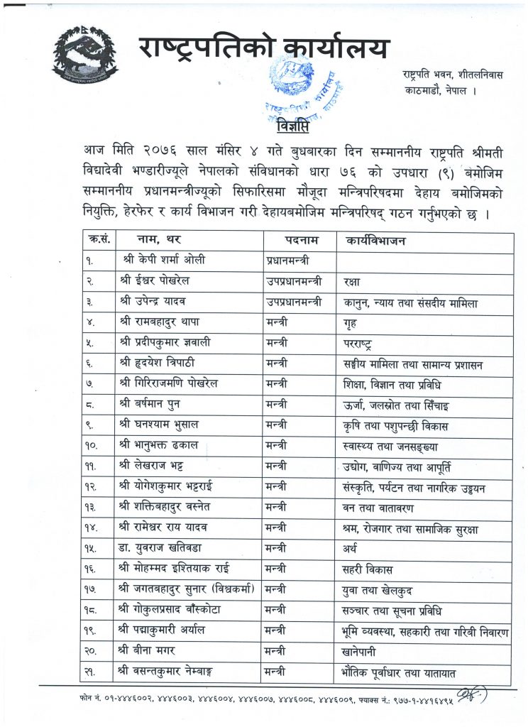 'नेपालको संविधानको धारा ७६ को उपधारा (९) बमोजिम सम्माननीय प्रधानमन्त्रीज्यूको सिफारिसमा मौजूदा मन्त्रिपरिषदमा देहाय बमोजिमको नियुक्ति, हेरफेर र कार्य विभाजन गरी देहायबमोजिम मन्त्रिपरिषद् गठन गर्नुभएको छ,' राष्ट्रपतिले जारी गरेको विज्ञप्तिमा भनिएको छ।