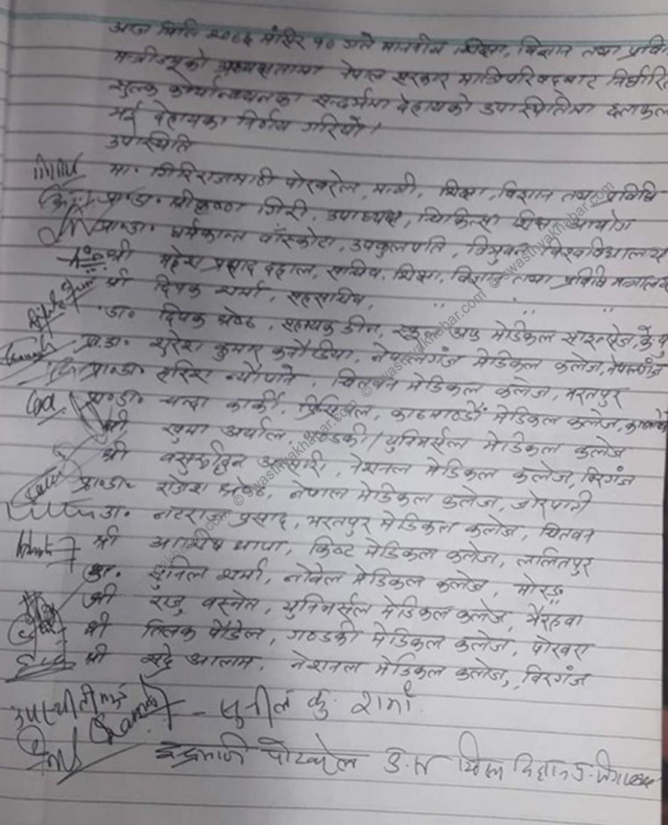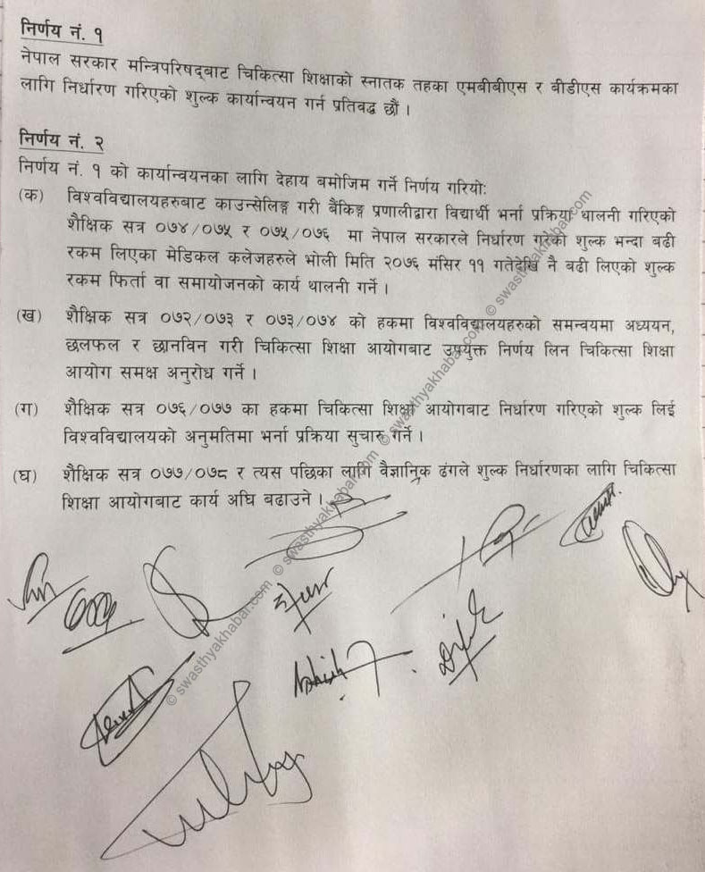 शिक्षा मन्त्री गिरिराजमणि पोखरेल, विश्वविद्यालया उपकुलपतिहरु, चिकित्सा शिक्षा आयोगका उपाध्यक्ष, शिक्षा मन्त्रालयका सचिव र निजी मेडिकल कलेजका सञ्चालकहरुको छलफलले शुल्क समायोजनका विषयमा २ बुँदे निर्णय गरेको हो।