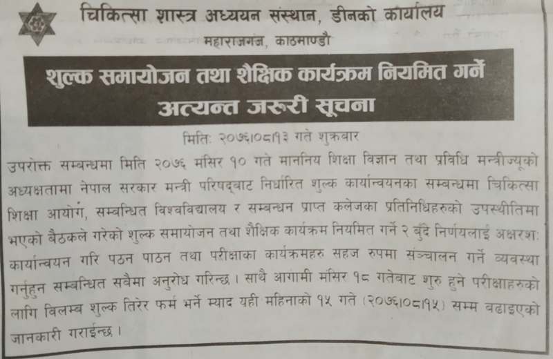 आइओएम डीन कार्यालयले यही मंसीर १८ गतेबाट हुने परीक्षाहरुको लागि विलम्ब शुल्क तिरेर मंसीर १५ गतेसम्म फर्म सकिने समेत जनाएको छ।
