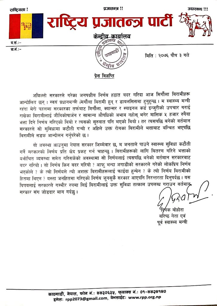 ‘बिरामीहरूको लागि वितरण गरिने भत्ताको यथोचित व्यवस्था समेत गरिसकेको अवस्थामा सो निर्णयलाई त्यसपछि बनेको बर्तमान सरकारबाट बदर गरियो। सो निर्णय किन बदर गरियो ? आफूभन्दा अगाडिको सरकारले गरेको लोकप्रिय निर्णय भएकोले ? के त्यो निर्णयले त्यो अशक्त बिरामीहरूलाई फाइदा हुन्थेन ? के त्यो निर्णय बिरामीको हितमा थिएन ?’ उनले विज्ञप्ति मार्फत सरकारलाई प्रश्न गरेका छन्।
