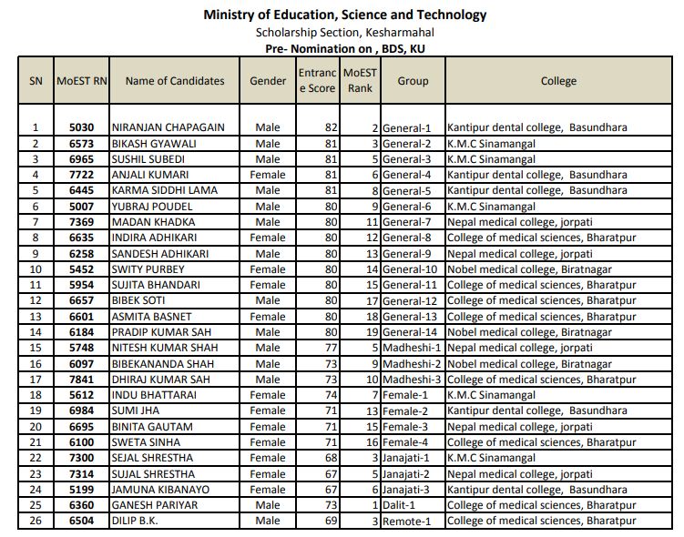काठमाडौं- शिक्षा, विज्ञान तथा प्रविधि मन्त्रालयले त्रिभुवन र काठमाडौं विश्वविद्यालय अन्तर्गतका मेडिकल कलेजमा बिडिएस अध्ययनका लागि छात्रवृत्तिमा नाम निकाल्न सफल भएका विद्यार्थीहरुको पूर्व मनोनयन सूची सार्वजनिक गरेको छ।