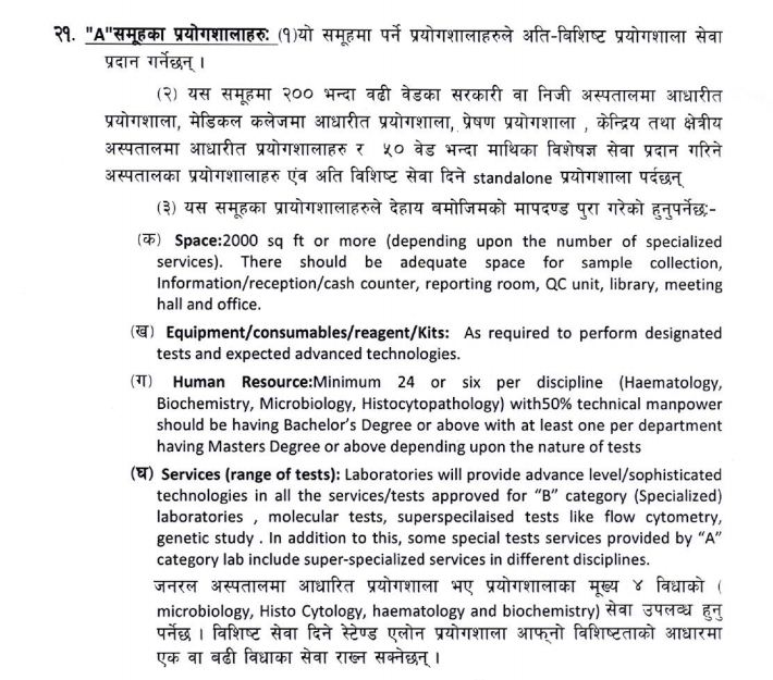 निर्देशिकाले देशभरमा सञ्चालनमा रहेका प्रयोगशालाहरुलाई जनस्वास्थ्य, अस्पतालमा आधारित, प्रयोगशाला सेवा मात्र दिने, अनुसन्धान, प्रेषण र रिफरेन्स (सन्दर्भ) गरी ५ प्रकारमा वर्गीकरण गरेको छ। यसरी केन्द्रदेखि स्थानीय तहसम्म वर्गीकरण गरिएका प्रयोगशालाहरुलाई क्षमता, पूर्वाधार, जनशक्ति लगायतका आधारमा ‘ए’, ‘बी’, ‘सी’, ‘डी’ र ‘ई’ गरी पाँच समूहमा विभाजन गरिएको छ।