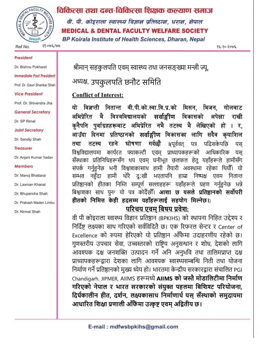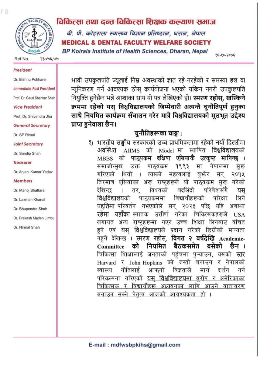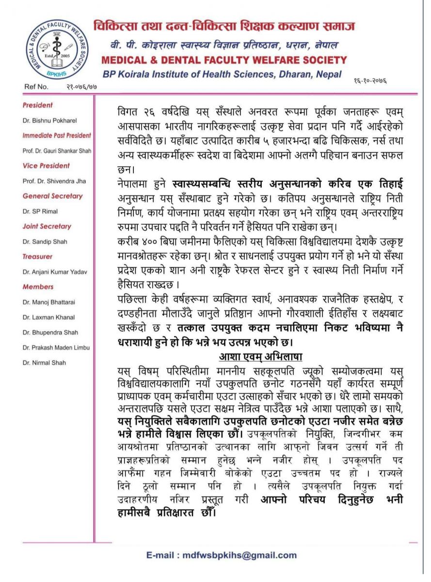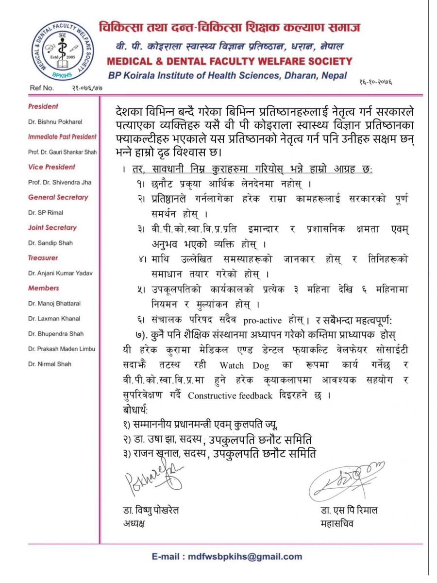 समाजका अध्यक्ष डा विष्णु पोखरेल र महासचिव डा एसपी रिमालको हस्ताक्षर रहेको उक्त ज्ञापन पत्रको बोधार्थ प्रतिष्ठानका कुलपति समेत रहेका प्रधानमन्त्री केपी शर्मा ओली र उपकुलपति छनोट समितिका दुई सदस्य उषा झा र राजन खनाललाई दिइएको छ।