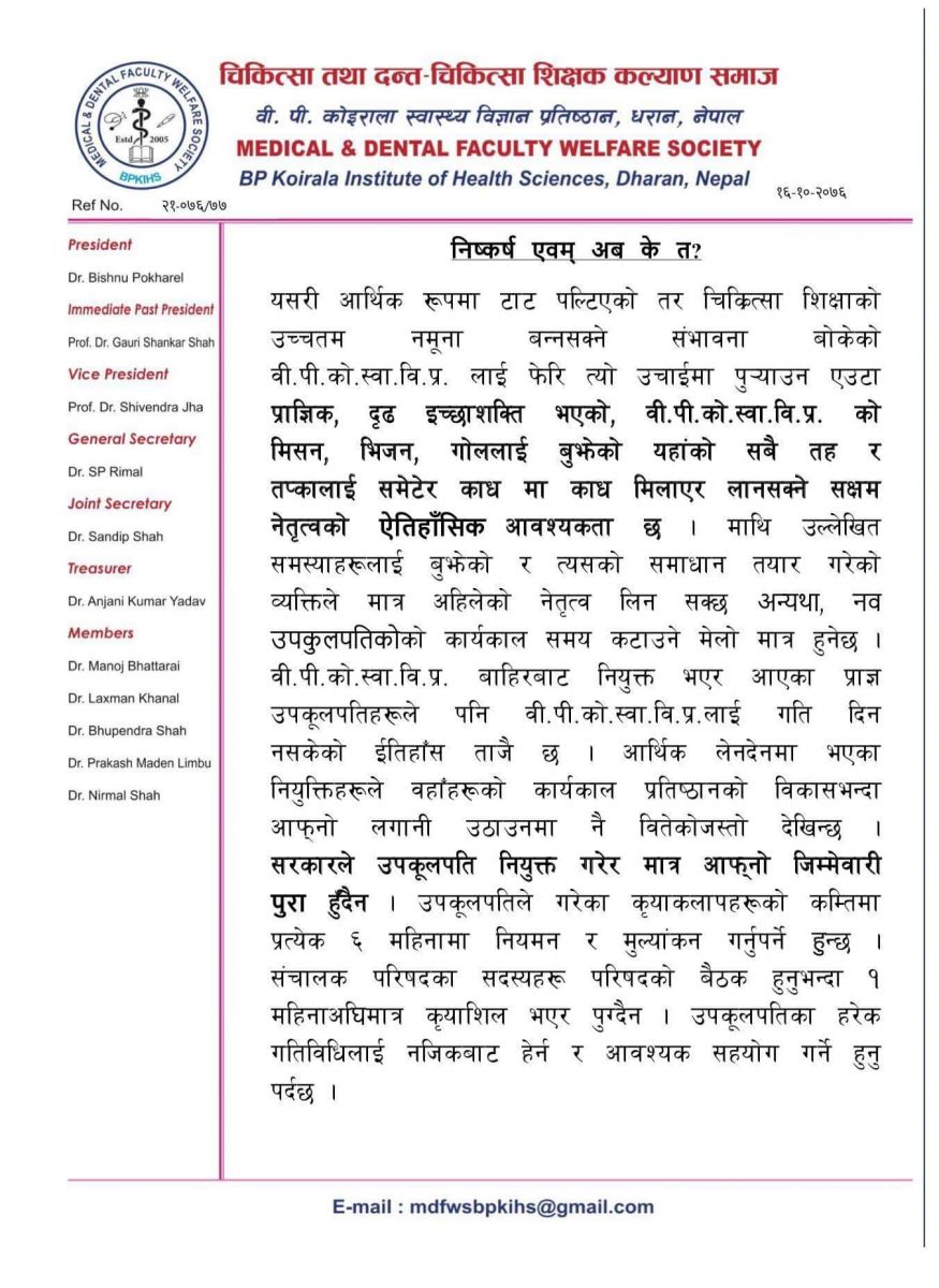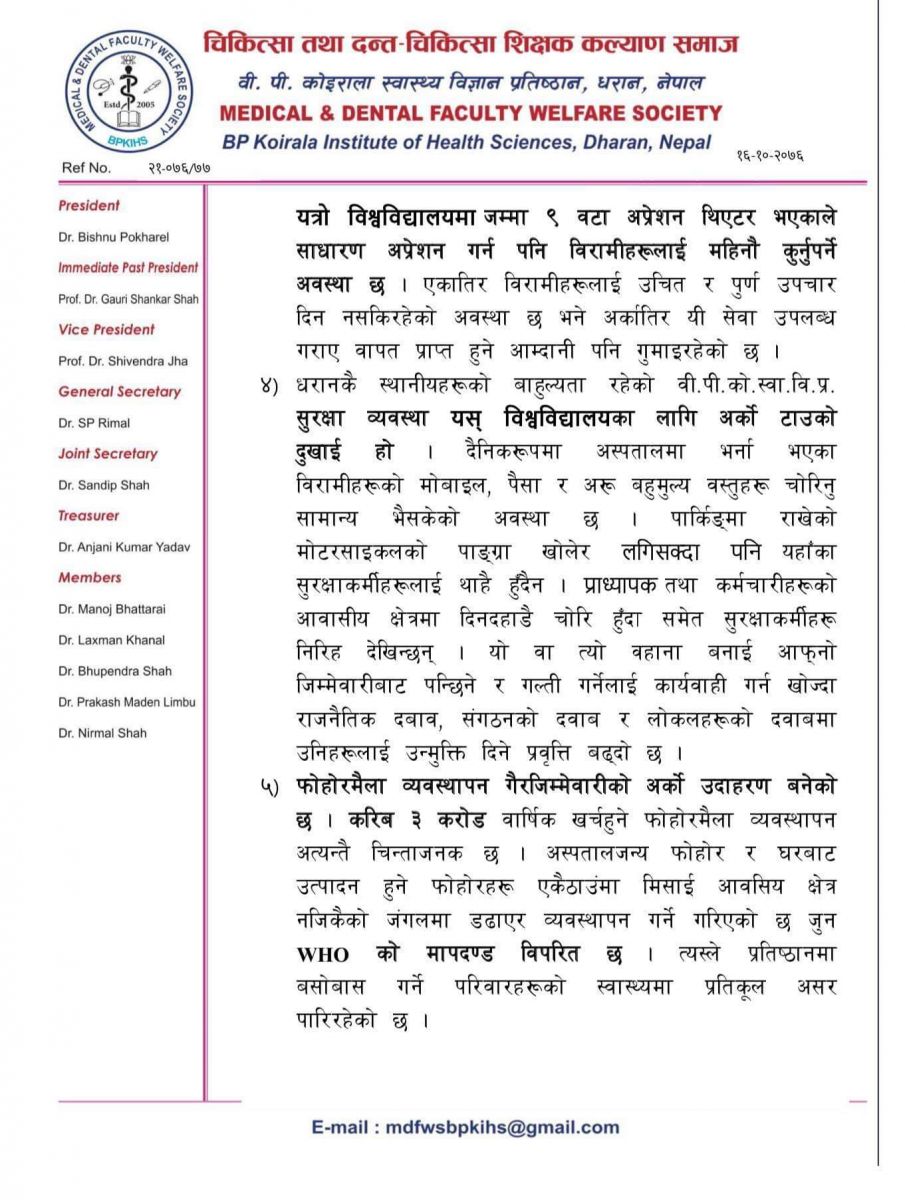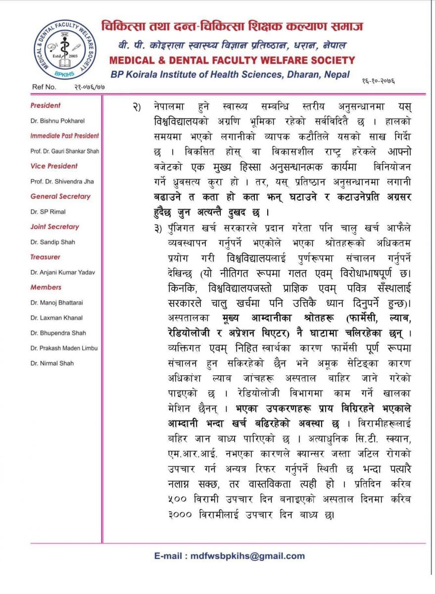 समाजका अध्यक्ष डा विष्णु पोखरेल र महासचिव डा एसपी रिमालको हस्ताक्षर रहेको उक्त ज्ञापन पत्रको बोधार्थ प्रतिष्ठानका कुलपति समेत रहेका प्रधानमन्त्री केपी शर्मा ओली र उपकुलपति छनोट समितिका दुई सदस्य उषा झा र राजन खनाललाई दिइएको छ।