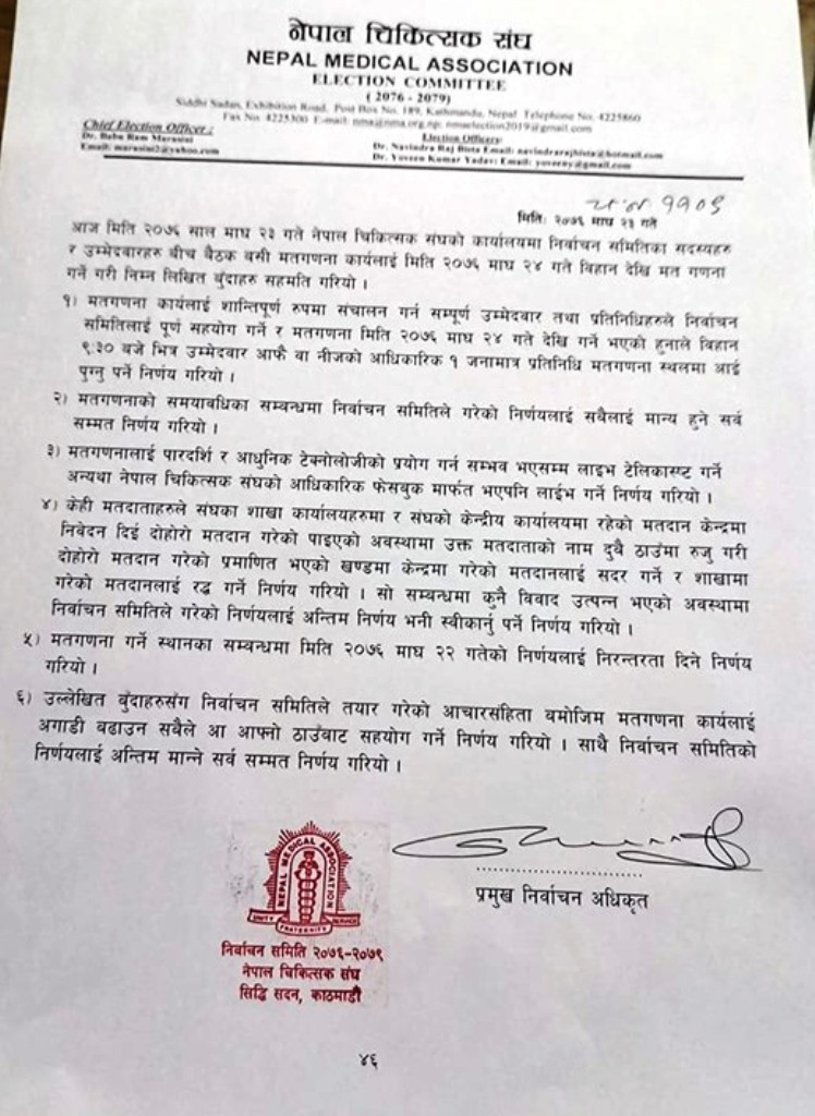 मतगणनाका लागि बिहान साढे ९ बजेभित्र संघको कार्यालयमा उपस्थित भइसक्नु पर्ने र मतगणना फेसबुक तथा अन्य प्रविधि मार्फत लाइभ गर्ने सहमति समेत भएको छ।