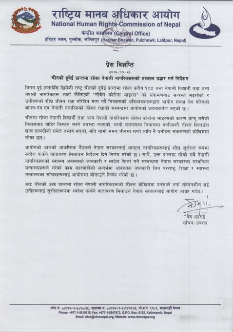 काठमाडौं- नेपाल मानव अधिकार आयोगले चीनको हुवेईका नेपाली नागरिकलाई तत्काल उद्धार गरी स्वदेश फर्काउन सरकारलाई निर्देशन दिएको छ।