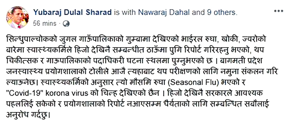 जुगल गाउँपालिकाको गुम्बामा देखिएको समस्या कोरोना नभई मौसमी रुघाखोकी भएको मन्त्रालयका प्रवक्ता महेन्द्रप्रसाद श्रेष्ठले जानकारी दिए। उनले भने, ‘सिन्धुपाल्चोकमा देखिएको बिरामीमा कोरोना होइन, मौसमी रुघाखोकी हो। गलत सन्देशले भ्रम मात्र फैलियो।’ बिरामीको उपचार र रोगबारे अध्ययनका लागि जिल्ला स्वास्थ्य कार्यालय सिन्धुपाल्चाकको टोलीलाई खटाइएको उनले बताए।