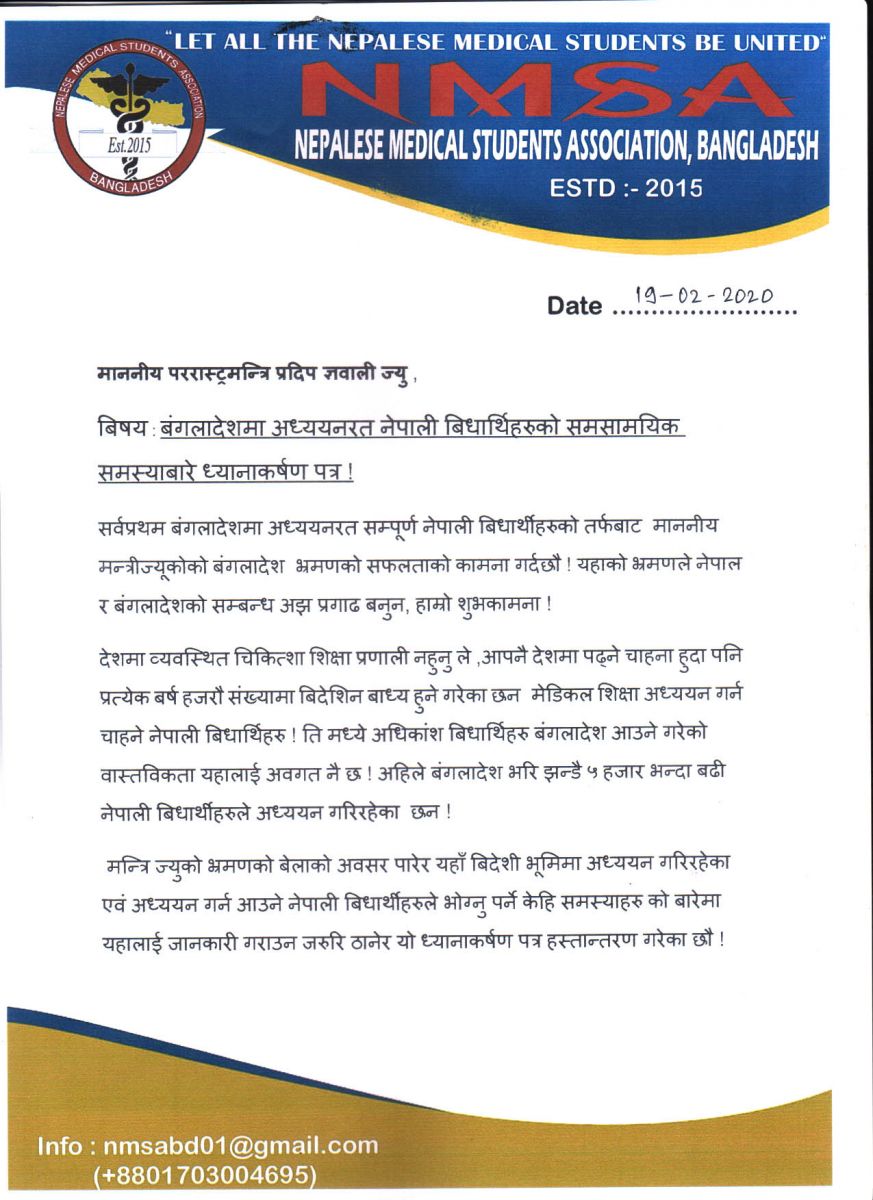 देशमा व्यवस्थित चिकित्सा शिक्षा प्रणाली नहुँदा आफुहरु अध्ययनका लागि विदेशिन बाध्य भएको उनीहरुले बताएका छन् । करीब ५ हजार बढी नेपाली अध्ययनका लागि बंगलादेशमा पुगेको पत्रमा उल्लेख गरिएको छ।