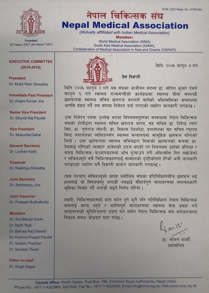 ‘छलफलमा सवस्थ्य सचिवद्वारा बिमाको छलफलका क्रममा डा देवलाई गरिएको व्यवहार आवेशको उपज भएको तर नियतवस उहाँको प्रतिष्ठा र समग्रग चिकित्सक तथा प्राध्यापकहरुमा आँच पुर्याउने गरी अभिव्यक्ति दिन नखोजेको र सचिवज्युले सबै चिकित्सकलाई सम्मानको दृष्टिकोणले हरेको भनी जानकारी गराइएको,’ संघद्वारा जारी विज्ञप्तिमा भनिएको छ।
