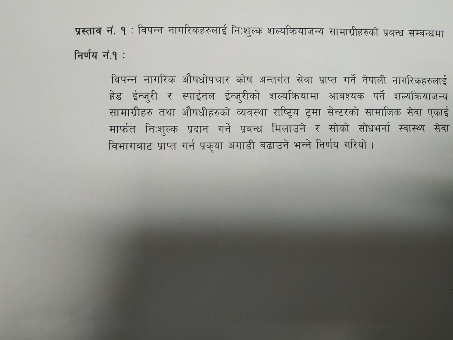 सामाजिक सेवा एकाई मार्फत निःशुल्क प्रदान गर्ने प्रबन्ध मिलाउने’ निर्णयमा भनिएको छ, ‘सोको सोधभर्ना स्वास्थ्य सेवा विभागबाट प्राप्त गर्ने प्रक्रिया अगाडि बढाउने निर्णय गरियो।’