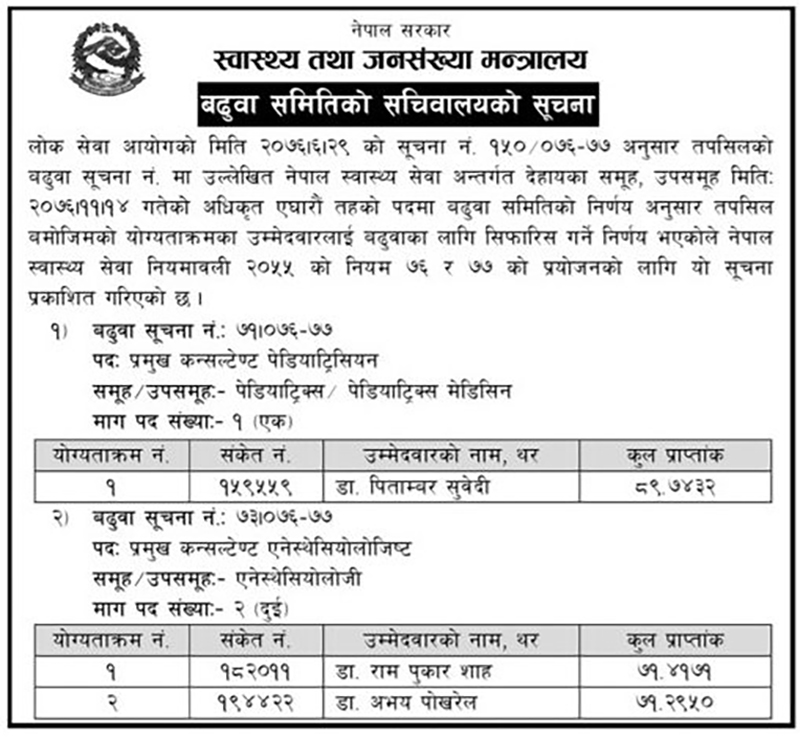 डा सुवेदीलाई प्रमुख कन्सल्ट्यान्ट पेडियाट्रिसियन, डा शाह र डा पोखरेललाई प्रमुख कन्सलटेन्ट एनेस्थेसियोलोजिस्ट पदमा बढुवाका लागि सिफारिस गरिएको बढुवा समितिले जनाएको छ।