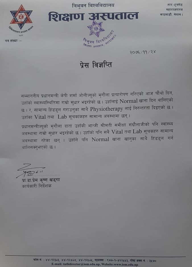 मिर्गौला प्रत्यारोपण गरिएको चौँथो दिनमा प्रधानमन्त्री ओलीको स्वास्थ्यमा राम्रो सुधार आइरहेको अस्पतालले जनाएको छ। उनको भाइटल र ल्याब सूचकांकहरु सामान्य अवस्थामा रहेको अस्पतालले जारी गरेको विज्ञप्तिमा उल्लेख गरिएको छ।