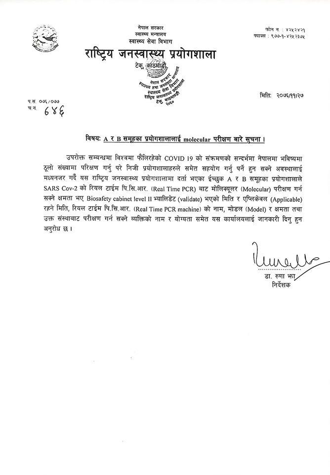 हालसम्म जनस्वास्थ्य प्रयोगशालामा मात्र कोरोना भाइरसको नमुना परीक्षण हुँदै आइरहेको छ। जनस्वास्थ्य प्रयोगशालाले ‘ए’ र ‘बि’ समूहमा रहेका निजी प्रयोगशालासँग सार्स कोभ–२को रियल टाइम पिसिआरबाट मोलिक्युल परीक्षण गर्न सक्ने क्षमता भए बायोसेफ्टि क्याबिनेट लेबल २को क्षमता भएका प्रयोगशालाको विवरण माग गरेको हो।