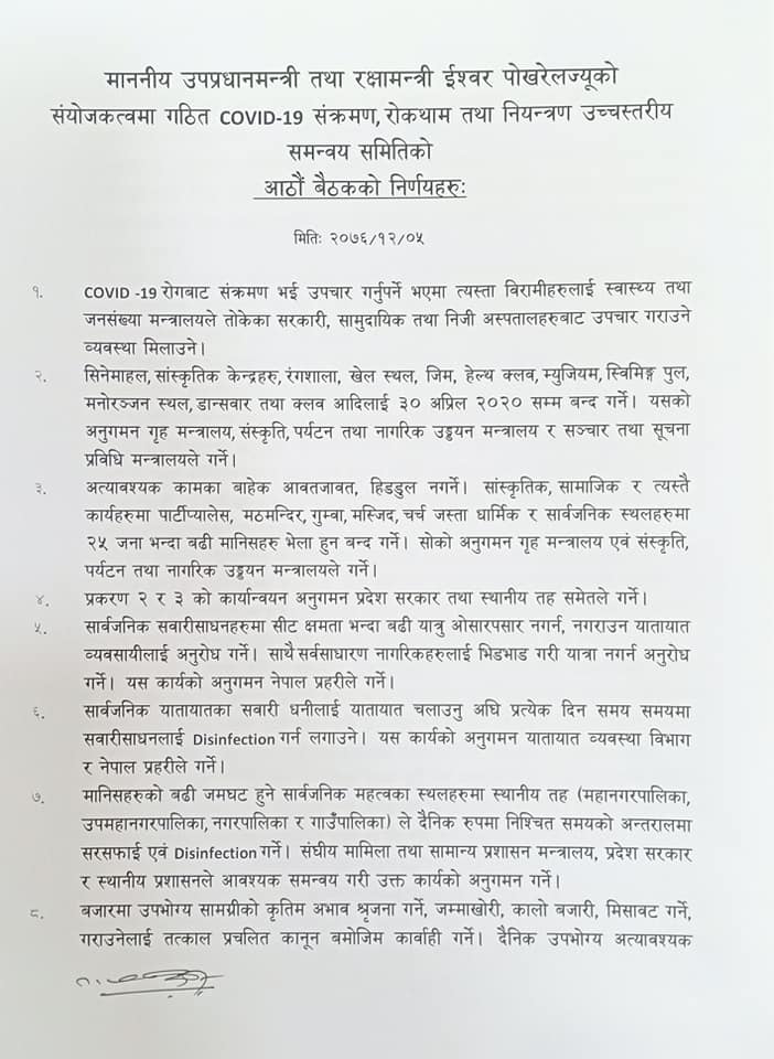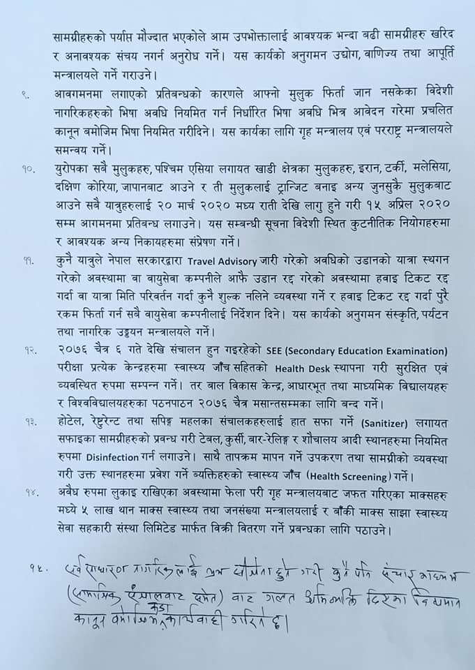 सरकारले १५ बुँदे निर्णय गर्दै कोरोना भाइरसको संक्रमण फैलन नदिन भेला, समारोह लगायतका कार्यक्रम समेत रोक्ने निर्णय गरेको छ।