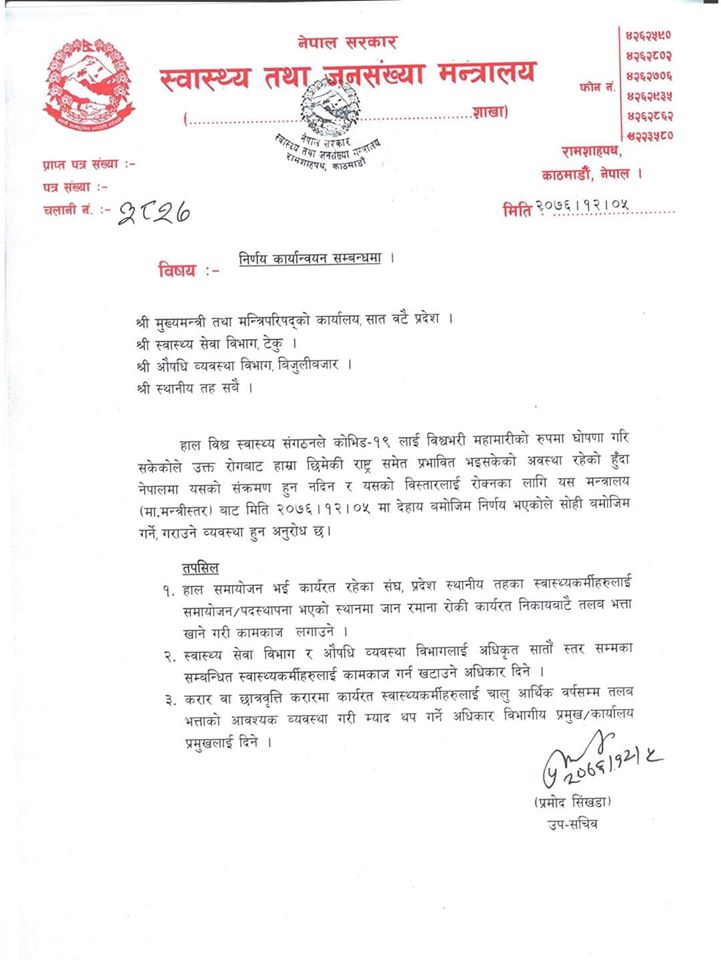मन्त्रालयले कोरोना भाइरसको संक्रमणलाई मध्यनजर गर्दै तत्कालिका लागि स्वास्थ्यकर्मीलाई समायोजन र पदस्थापना भएको स्थानमा जान रमाना रोकी कार्यरत निकायबाटै तलब भत्ता खाने गरी कामकाजमा लगाउने निर्णय गरेको हो।