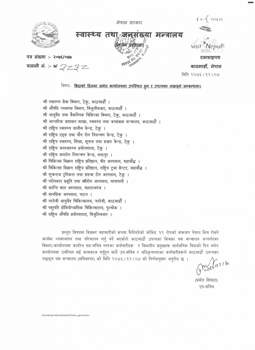काठमाडौैं- स्वास्थ्य तथा जनसंख्या मन्त्रालयले सहसचिव र विभागिगय प्रमखुलाई बिदाको दिनमा पनि काम गर्न निर्देशन दिएको छ। मन्त्रालयले कोरोना भाइरसको संक्रमण नेपालमा आउन नदिन र यो सँग सम्बन्धित काम गर्न कर्मचारीलाई बिदाको दिनमा पनि काम गर्न निर्देशन दिएको हो।