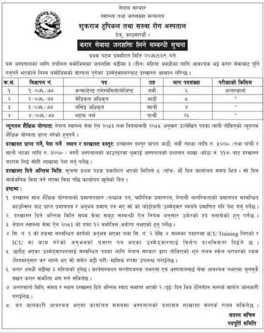 काठमाडौं- टेकुस्थित शुक्रराज ट्रपिकल तथा सरुवा रोग अस्पतालले डाक्टर र नर्स गरी ४४ जनालाई रोजगारी दिने भएको छ।