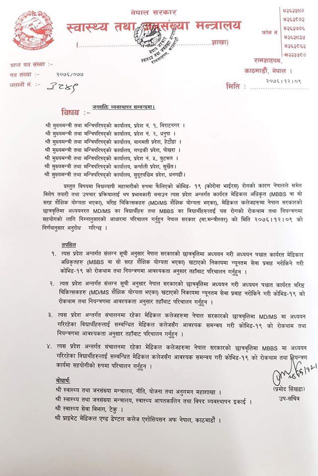 मन्त्रालयले सरकारी छात्रवृत्तिमा अध्ययन गरी विभिन्न स्वास्थ्य संस्थामा कार्यरत एमबिबिएस, एमडि/एमएस गरेका डाक्टरलाई कोरोना भाइरसको रोकथाममा परिचालन गर्न निर्देशन दिएको छ।
